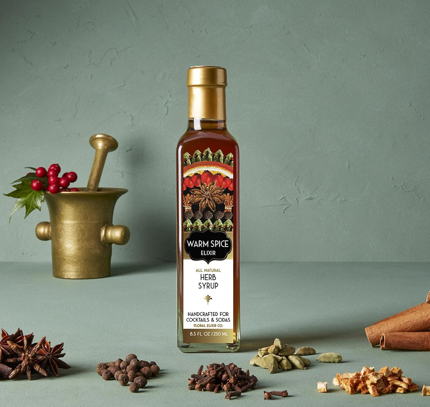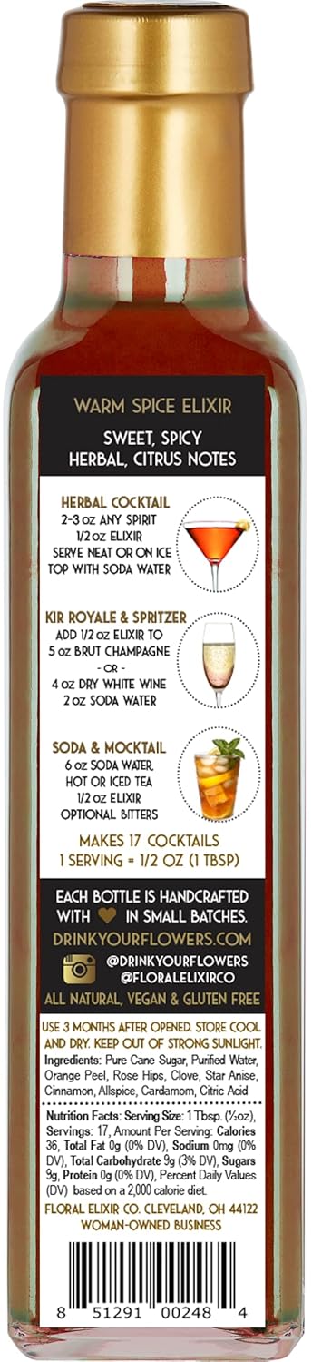 ELEVATE your drink – Add our Warm Spice Elixir to your favorite spirits for a rich, warm twist on cocktails. Create sodas and non-alcoholic cocktails with still or sparkling waters and teas.
